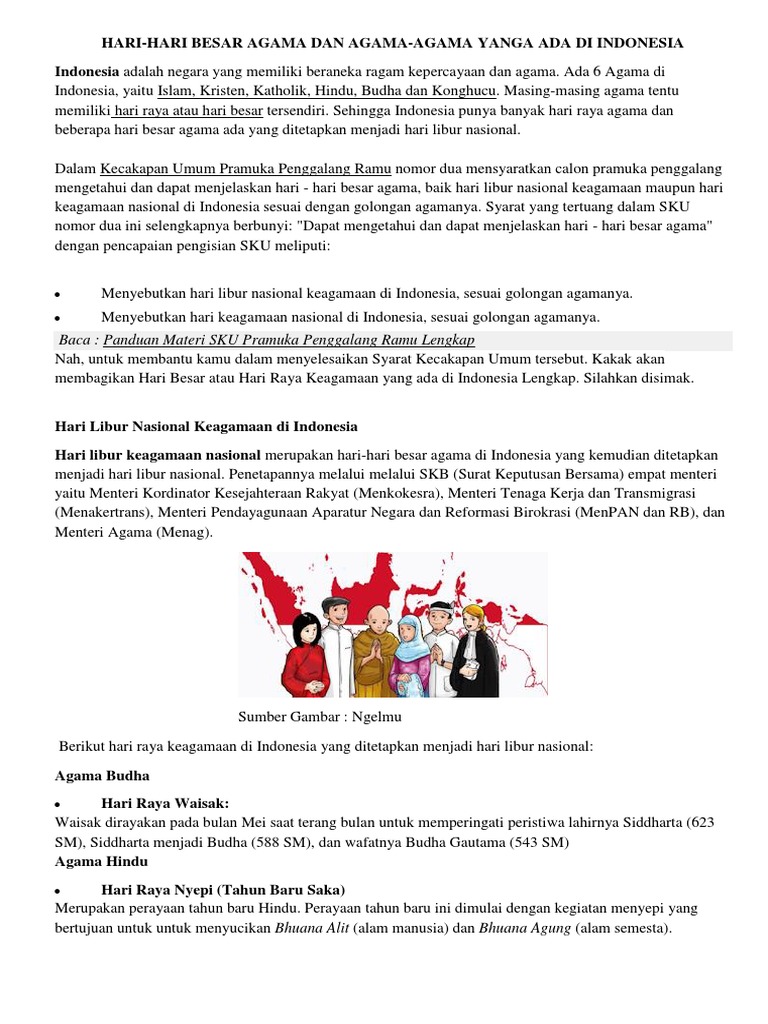Candi borobudur merupakan candi budha terbesar dan dijadikan sebagai tempat untuk merayakan festival hari waisak. Ketahui lebih lanjut latar belakang perayaan hari besar agama buddha ini. Penganut agama hindu memiliki kitab suci bernama weda. Agama islam merupakan agama di indonesia yang paling banyak penganutnya. (hari tri suci yang bahagia.